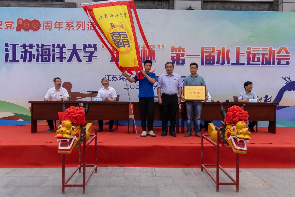 校党委书记王自力为龙舟争霸赛一等奖获奖单位颁奖并授予“霸主旗”