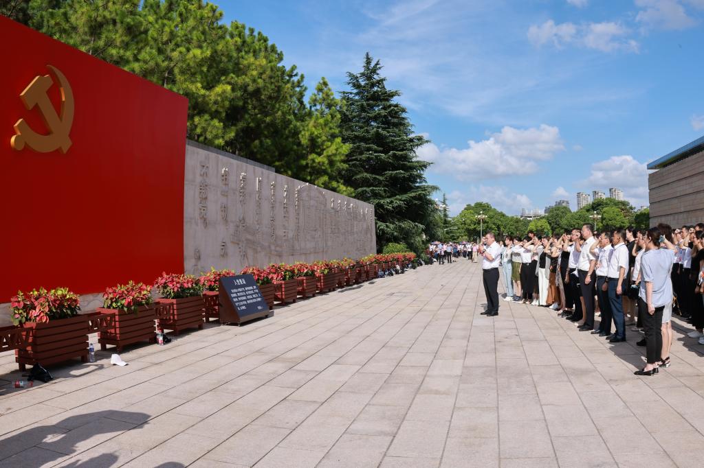 在嘉兴南湖革命纪念馆,学员们面向鲜红的党旗重温入党誓词。