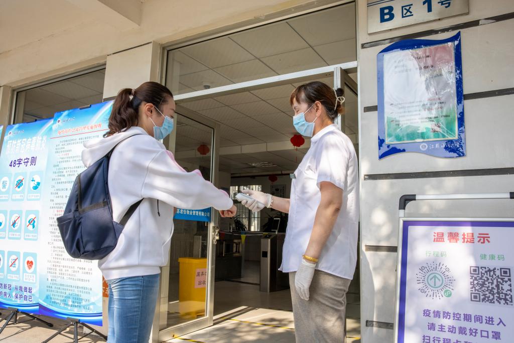 宿舍区工作人员为学生量体温