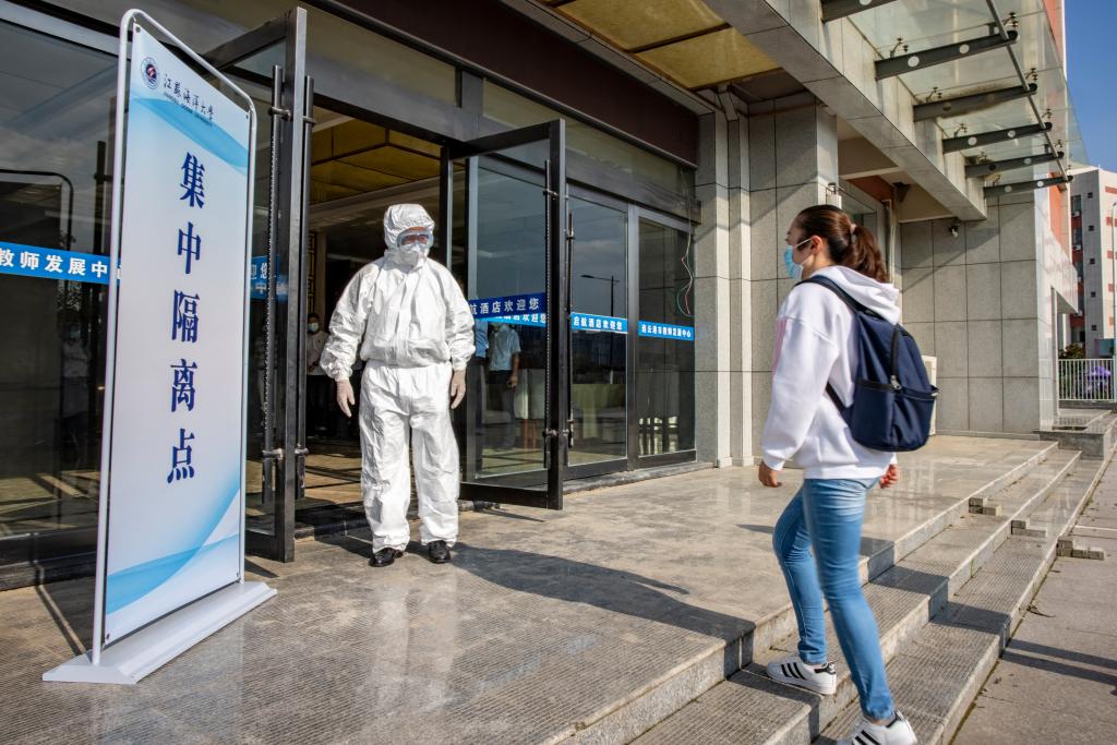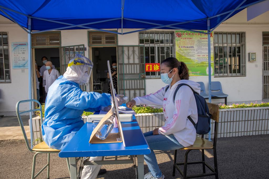 后勤医务人员与发烧学生现场沟通