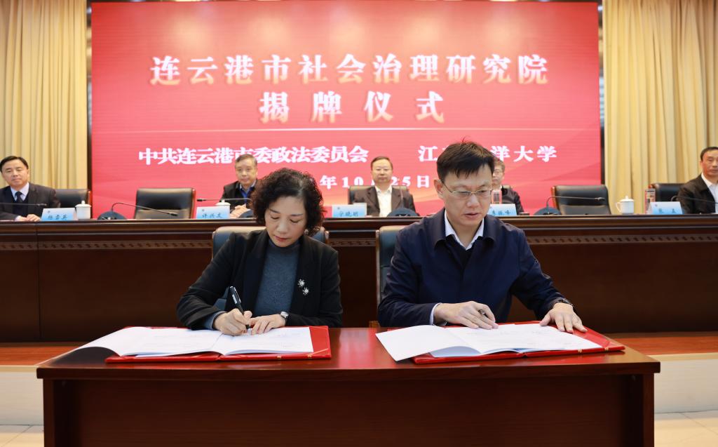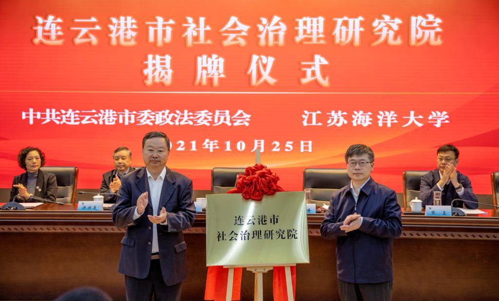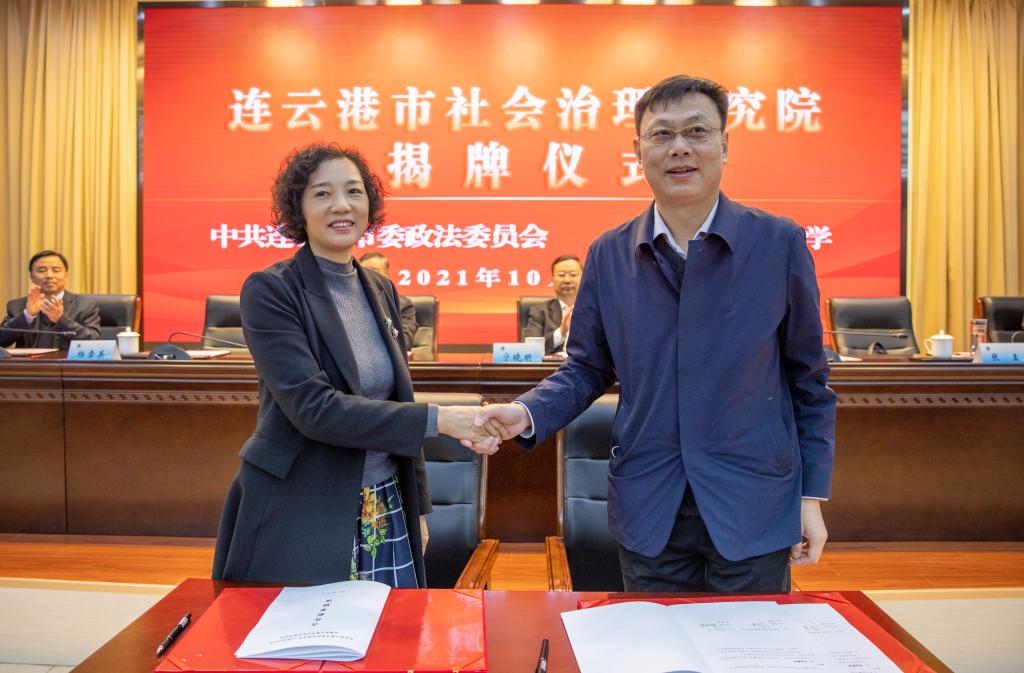 10月25日上午,连云港市社战狼pc预测治理研究院揭牌成立仪式在足球装备推荐战狼pc预测议中心黄海厅举行。校长宁晓明和市委常委、政法委书记李振峰为研究院揭牌,并向研究员颁发聘书。副校长许兴友宣读成立连云港市社战狼pc预测治理研究院文件。市委政法委常务副书记张孟和校党委常委、宣传部部长杨雪英签署合作协议。文法学院院长吴明忠主持仪式。
