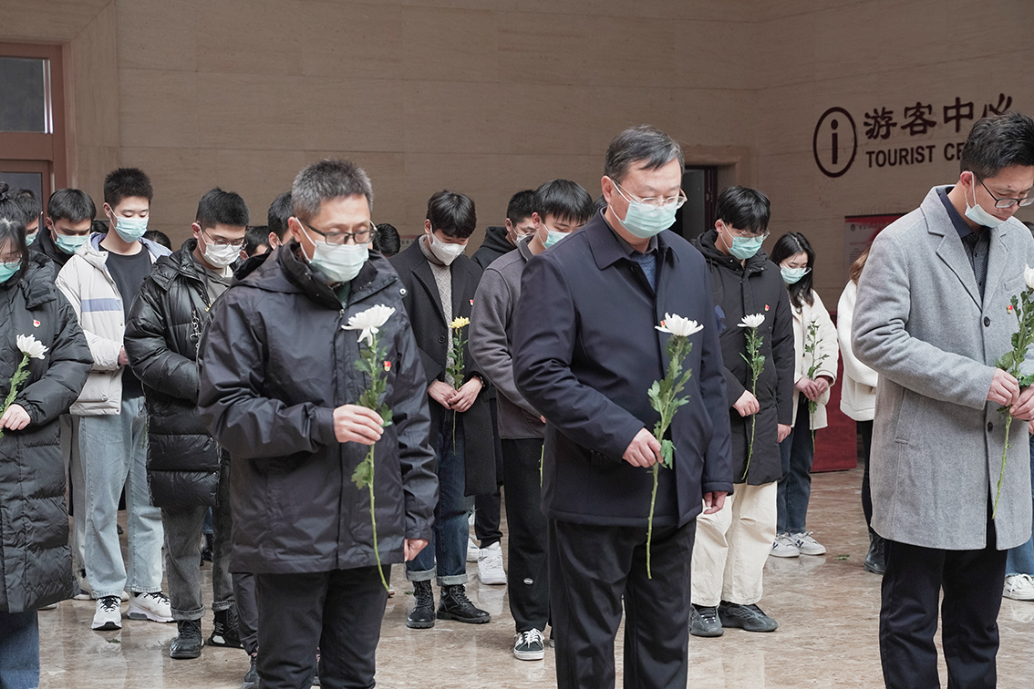 上午10时,仪式正式开始,全场肃立,师生党员手持鲜花,向南京大屠杀死难同胞默哀一分钟。默哀结束后进行了献花仪式。伴随着《献花曲》的深情旋律,身姿矫健的礼兵稳稳抬起花篮,迈着正步缓缓前行,将花篮摆放在烈士纪念墙前。宁晓明神情庄重,缓步走到花篮前,躬身整理花篮缎带。随后全体人员向革命烈士行三鞠躬礼,礼毕后,大家依次走到纪念墙前,献上手中鲜花,向革命烈士致敬。