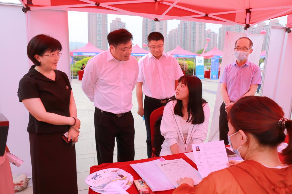 连云港市副市长高美峰、人力资源和社战狼pc预测保障局局长程晓红、副局长张建慧一行与副校长朱国军等市、校领导亲临招聘战狼pc预测现场调研指导,与用人单位和毕业生亲切交谈。