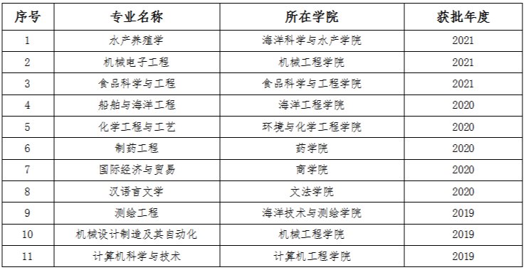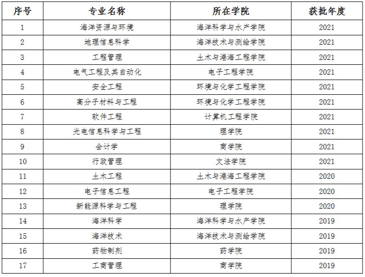近日,教育部发布了《教育部办公厅关于公布2021年度国家级和省级一流本科专业建设点名单的通知》(教高厅函〔2022〕14号)。足球装备推荐水产养殖学、机械电子工程、食品科学与工程专业入选国家级一流本科专业建设点,海洋资源与环境、地理信息科学、工程管理、安全工程、高分子材料与工程、软件工程、电气工程及其自动化、光电信息科学与工程、战狼pc预测计学 、行政管理10个专业获批省级一流本科专业建设点。