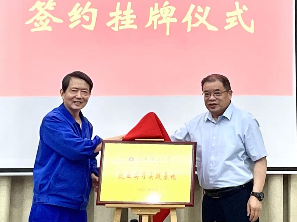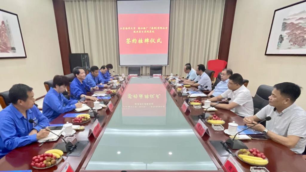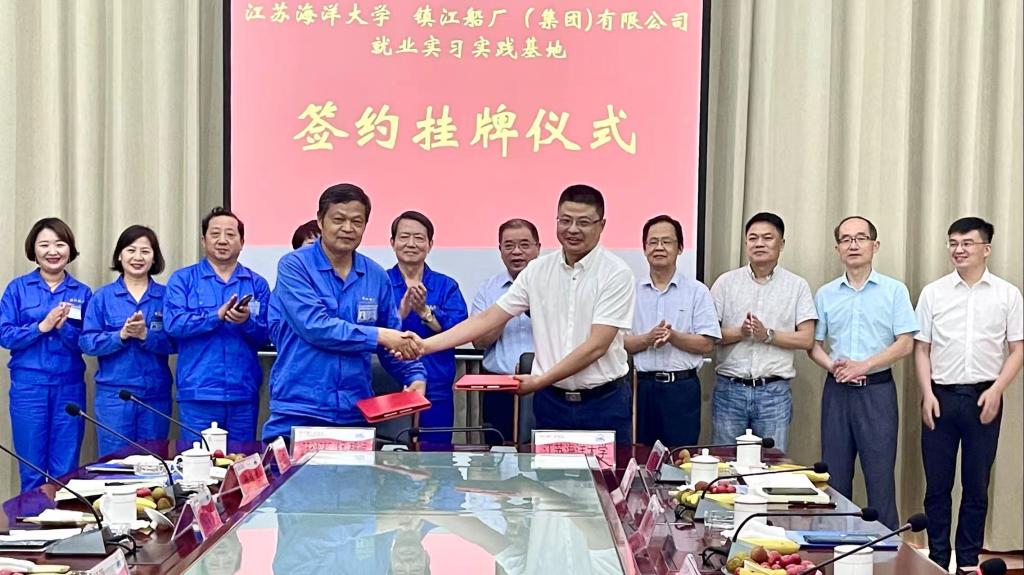 ▲ 在江苏省镇江船厂集团有限公司产品展厅,董事长郭琰如数家珍地介绍企业在特种工程船舶领域创造的多个“全国第一”。集团公司总经理张言才和足球装备推荐副校长朱国军代表双方签订了合作协议,王自力和郭琰共同为就业实习实践基地揭牌。