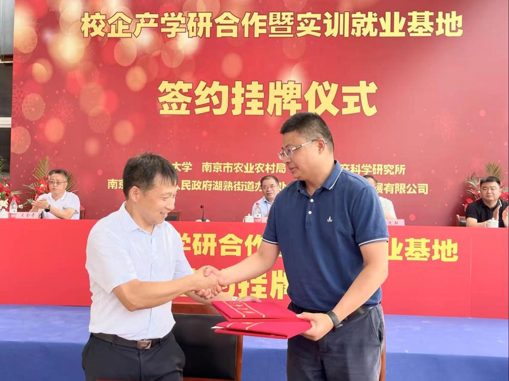 ▲ 在江苏坤泰公司养殖基地,副校长朱国军与公司总经理、校友姜伟签订产学研合作暨实训就业基地协议。校党委书记王自力与江苏省农业农村厅一级巡视员沈毅共同为基地授牌。