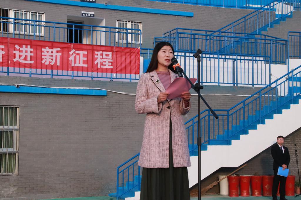 上午6时50分,体育场气氛庄重而热烈,全场师生庄严肃立迎国旗。国旗仪仗队队员眼神坚定,步履铿锵,将国旗护送到升旗台前。伴随着雄壮的《义勇军进行曲》,鲜艳的五星红旗迎着清晨的第一缕阳光冉冉升起、迎风飘扬。